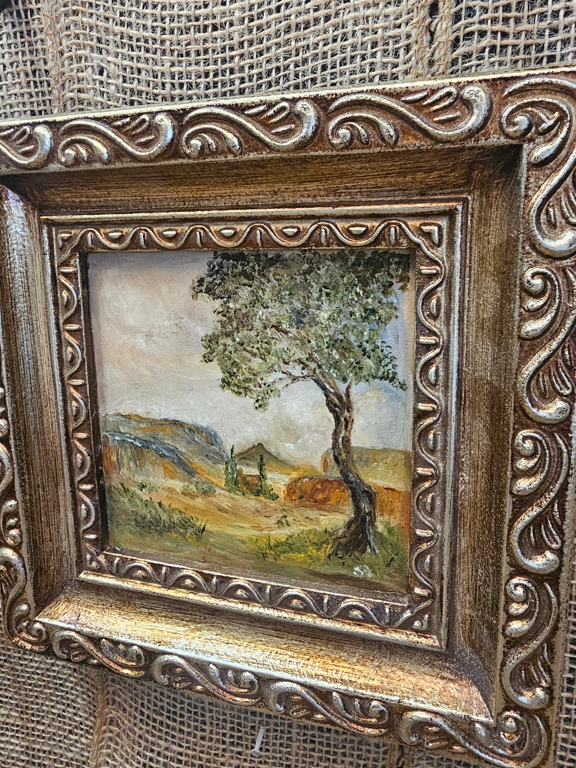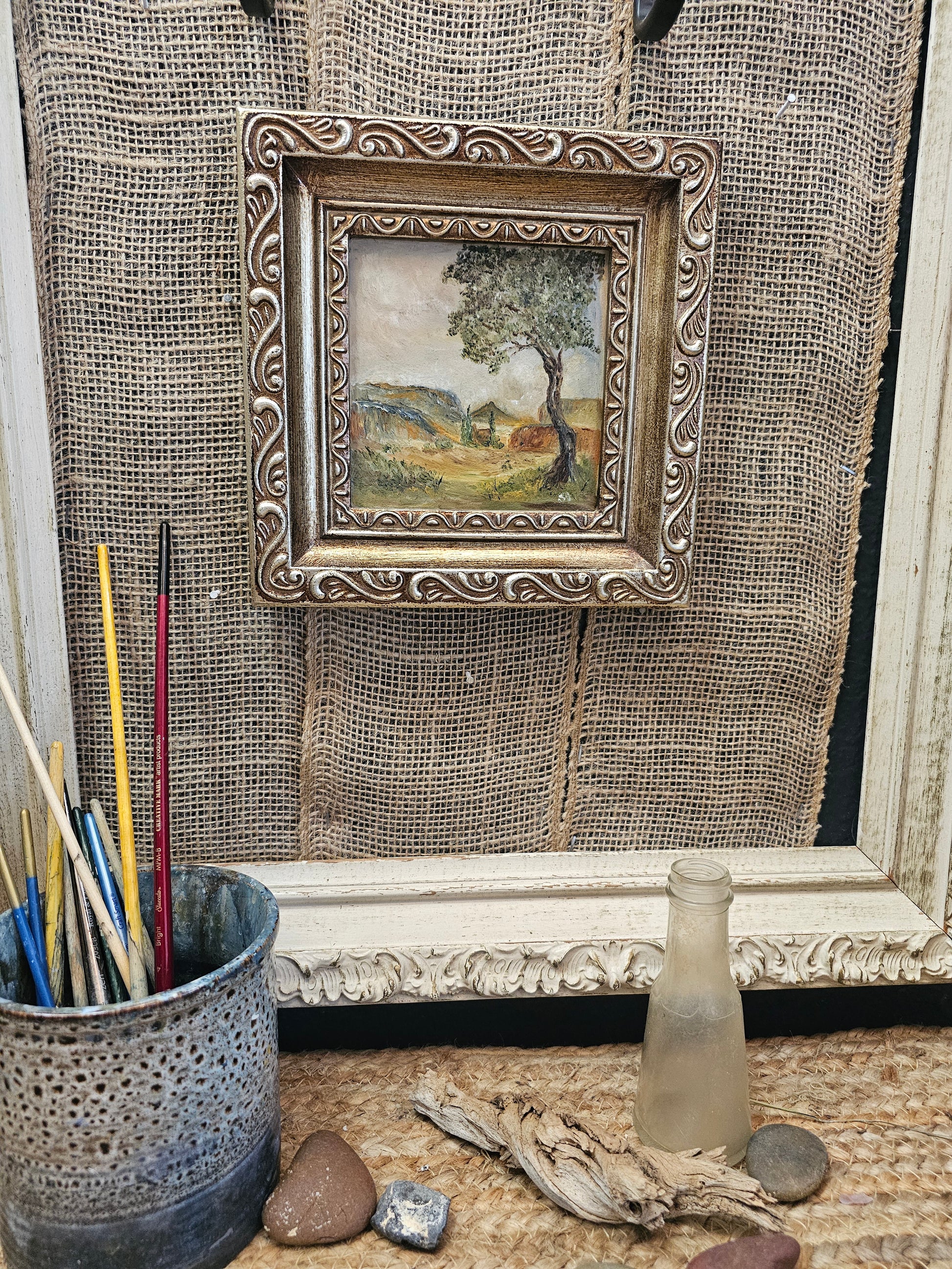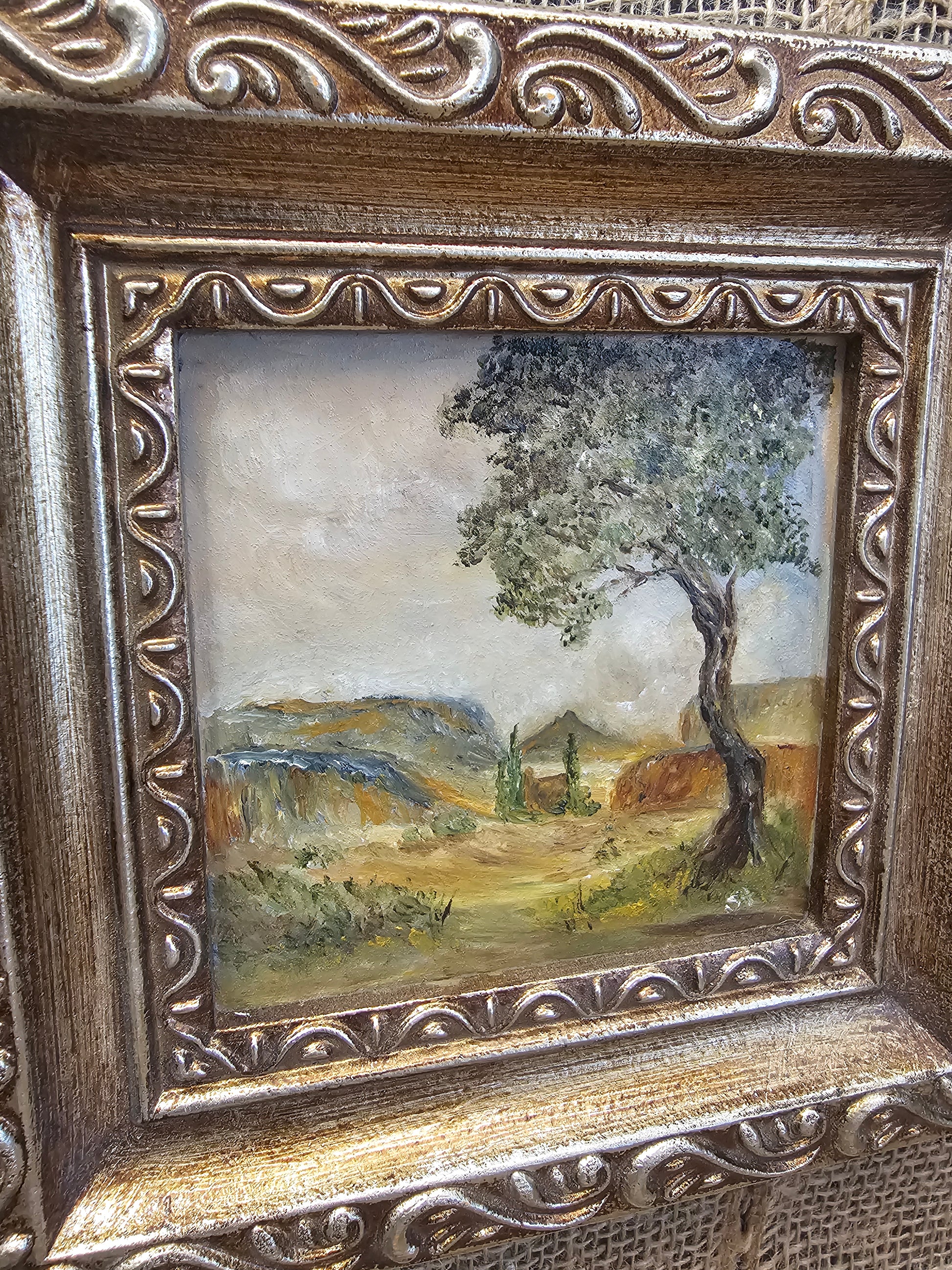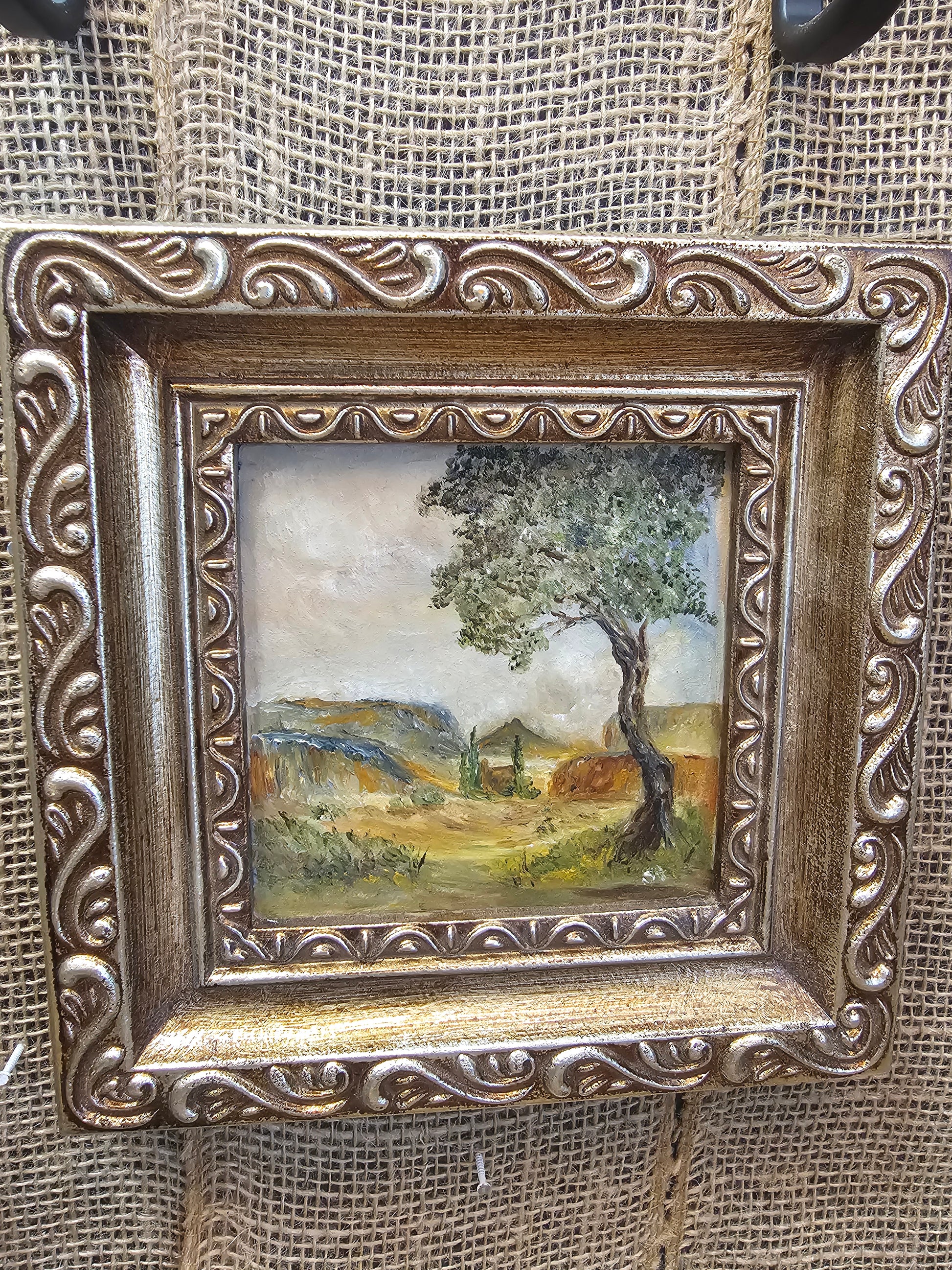 This is painted in cobra water mixable oil paints. Its 6x6 and it is actually part of the frame.